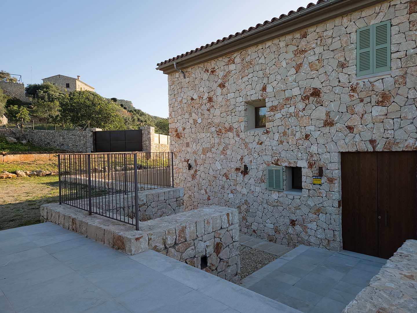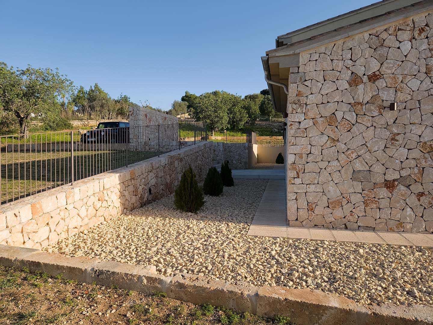 Mein Grundstück wird vollständig von einer 506 Meter langen mallorquinischen Natursteinmauer eingefasst. Stein für Stein gesetzt, mit Geduld und Handarbeit. Innerhalb dieser Mauer befinden sich an der unteren und oberen Grundstücksgrenze zwei große, sich automatisch öffnende Zufahrtstore sowie eine separate Eingangstür. Alle aus Roststahl, in einem warmen kaffeefarbenen Ton. Robust, ruhig und passend zu mir.
