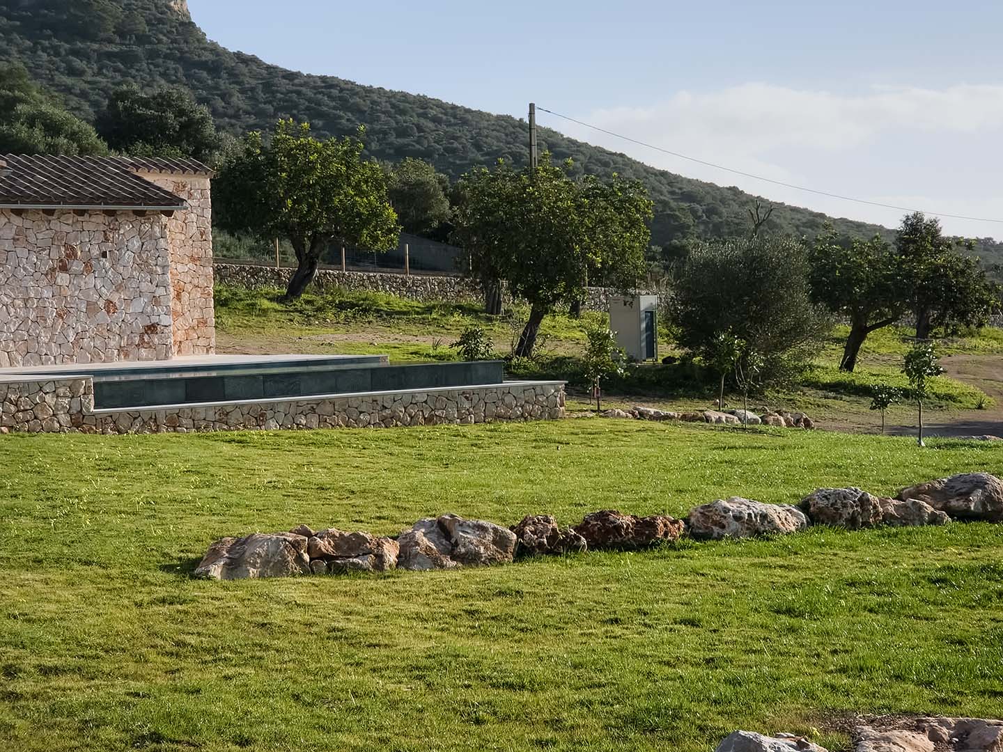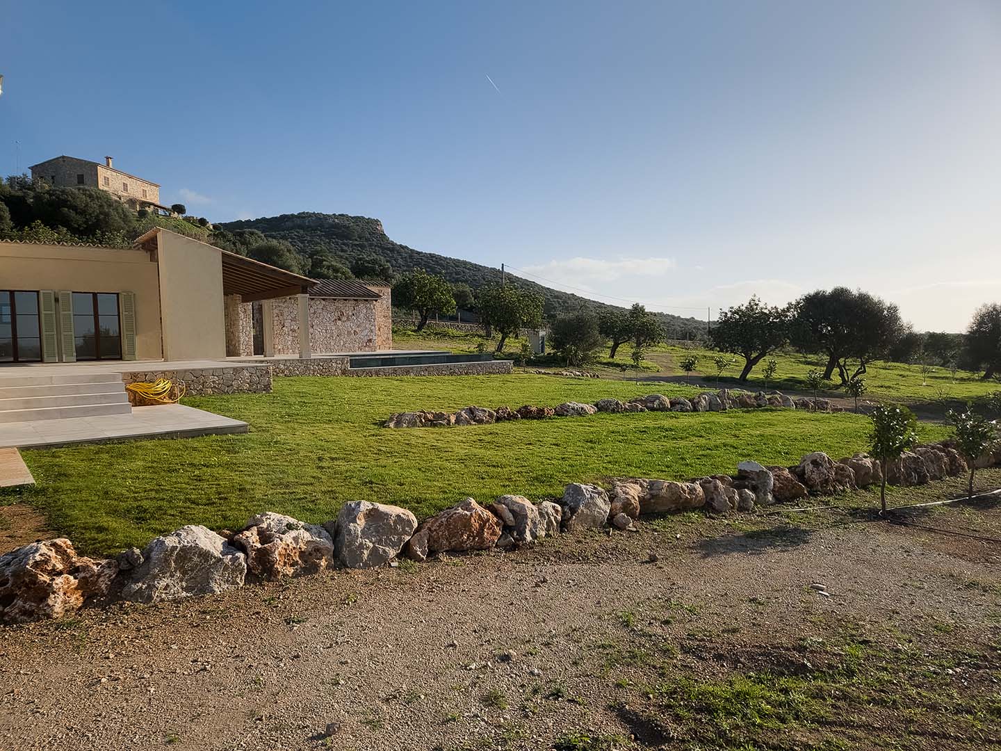 Auch mein Garten ist gewachsen. Obstbäume und zahlreiche Olivenbäume prägen das Grundstück und geben ihm Struktur und Charakter. Auf der Poolseite wurde ein neuer Rasen angelegt, selbstverständlich mit automatischer Bewässerung. Ein Ort für barfuß laufen, für lange Sommerabende und für das einfache Gefühl, da zu sein.