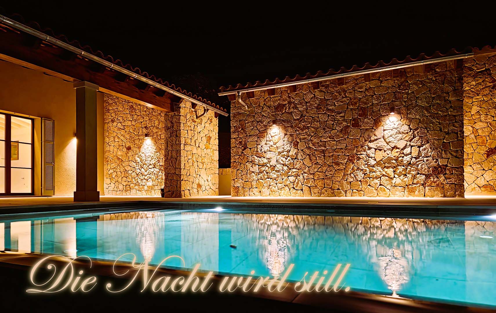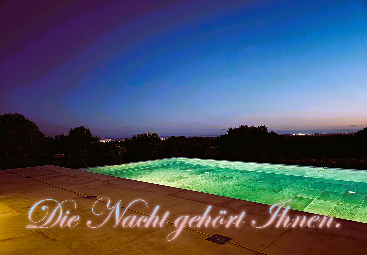 Mein Pool ist nun vollständig gefüllt und einsatzbereit. Tagsüber spiegelt sich der Himmel im Wasser, abends beginnt er zu leuchten und verleiht den Nächten eine besondere Ruhe.